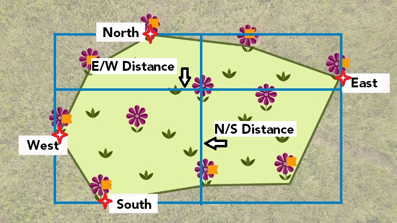 Subpopulation Dimensions: Visualize the subpopulation enclosed in a box that contains all the edges, as in the image above. Measure the subpopulation at its widest points E-W and N-S. Either stand at, or line up with, the furthest plant in each cardinal direction.