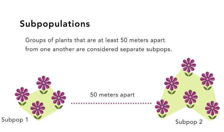 Subpop #: A subpopulation (or “subpop”) is a grouping of plants separated by at least 50 meters (see image below). When monitoring, we define the subpopulation area defined by the outmost individuals of our study species, plus 1 meter. Multiple subpopulations at a single site will each have a unique number. Use the same subpopulation number as established in previous years. If a new subpopulation is found contact staff.