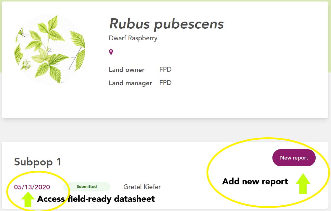 After selecting an assignment, you'll see a list of the subpopulations. The "New report" button in the upper right allows you to add a new monitoring report for that subpopulation. Please email info@plantsofconcern.org if you don't see the "New report" button.