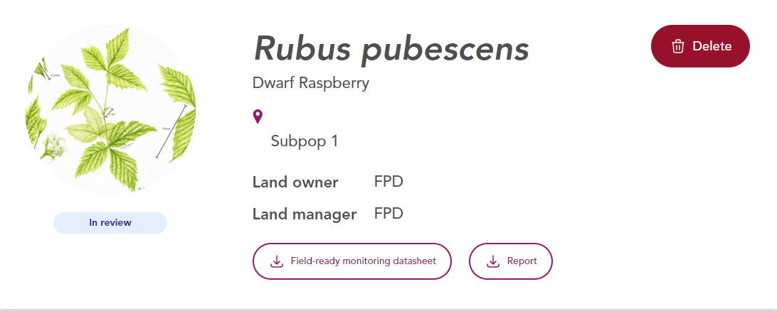 Field-ready monitoring datasheet - this paper datasheet combines previous data with space to record your observations. Print this datasheet from your Plants of Concern Web Account, fill it out in the field, and submit your data, along with a scanned copy of the datasheet through your Web Account.