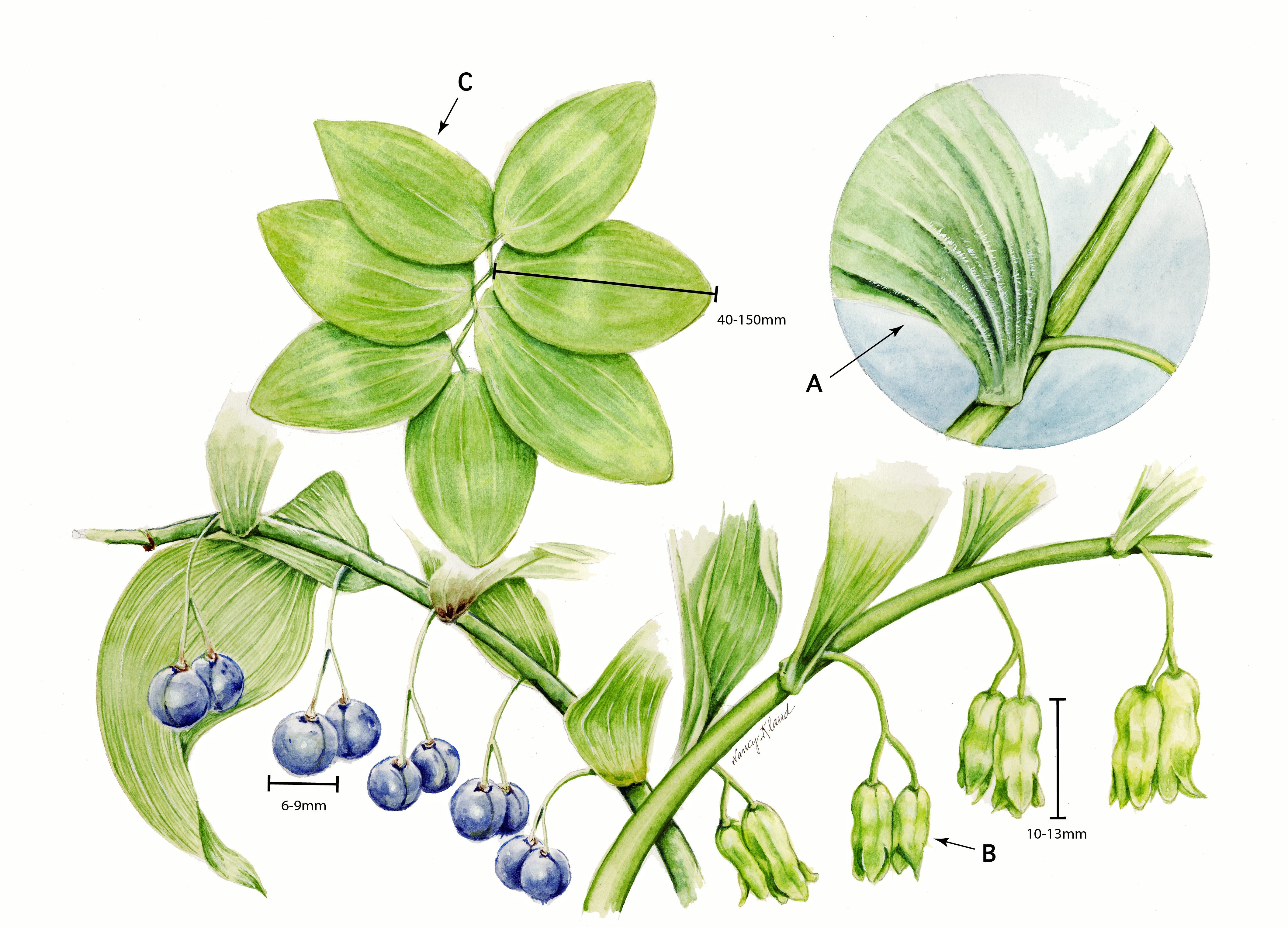 Left: Polygonatum pubescens (Downy Solomon's Seal - IL Threatened). All artwork by Nancy Klaud.
