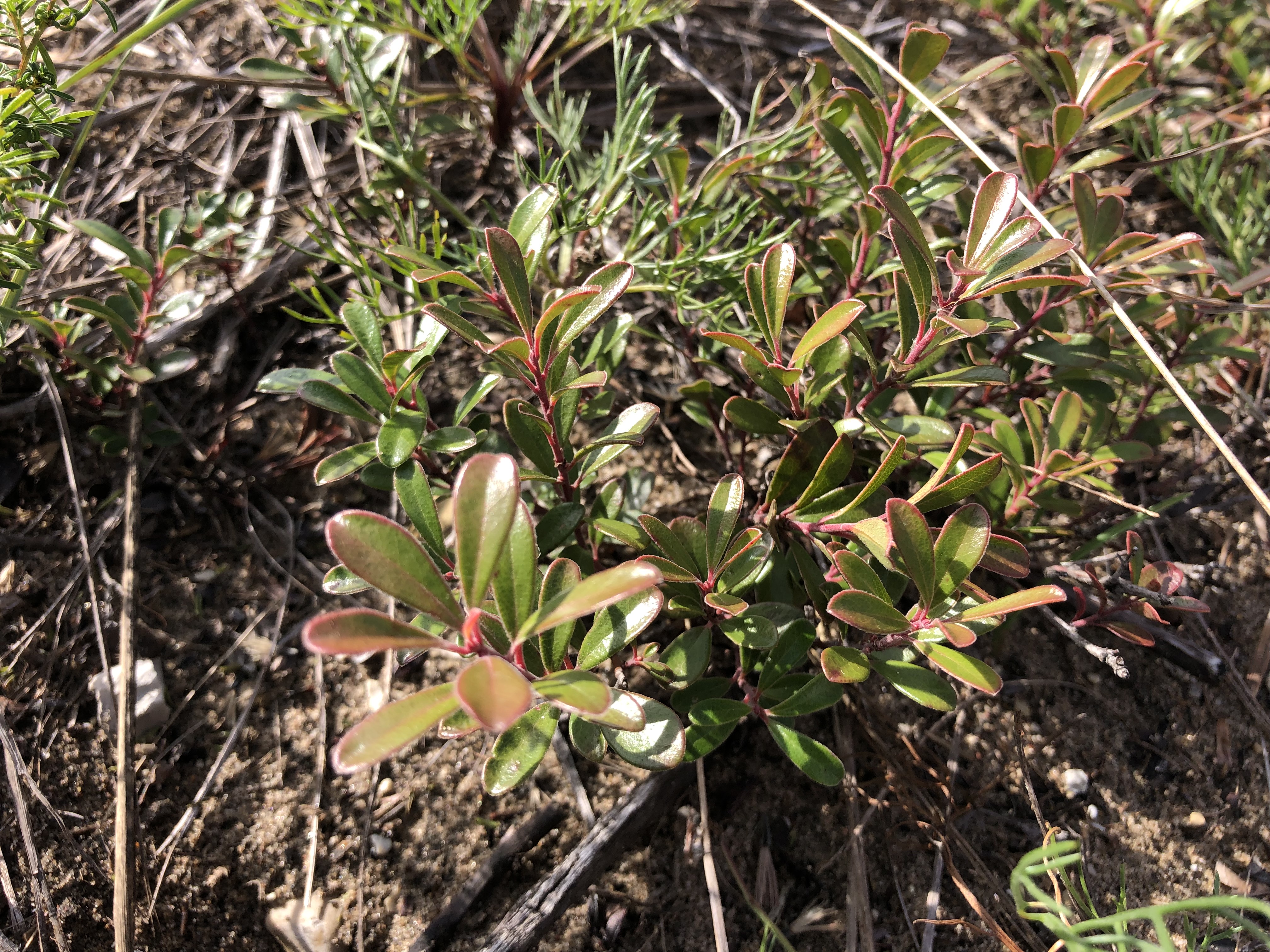 The evergreen Bearberry (Arctostaphylos uva-ursi) with Beach Wormwood (Artemisia campestris caudata) growing on open sand.