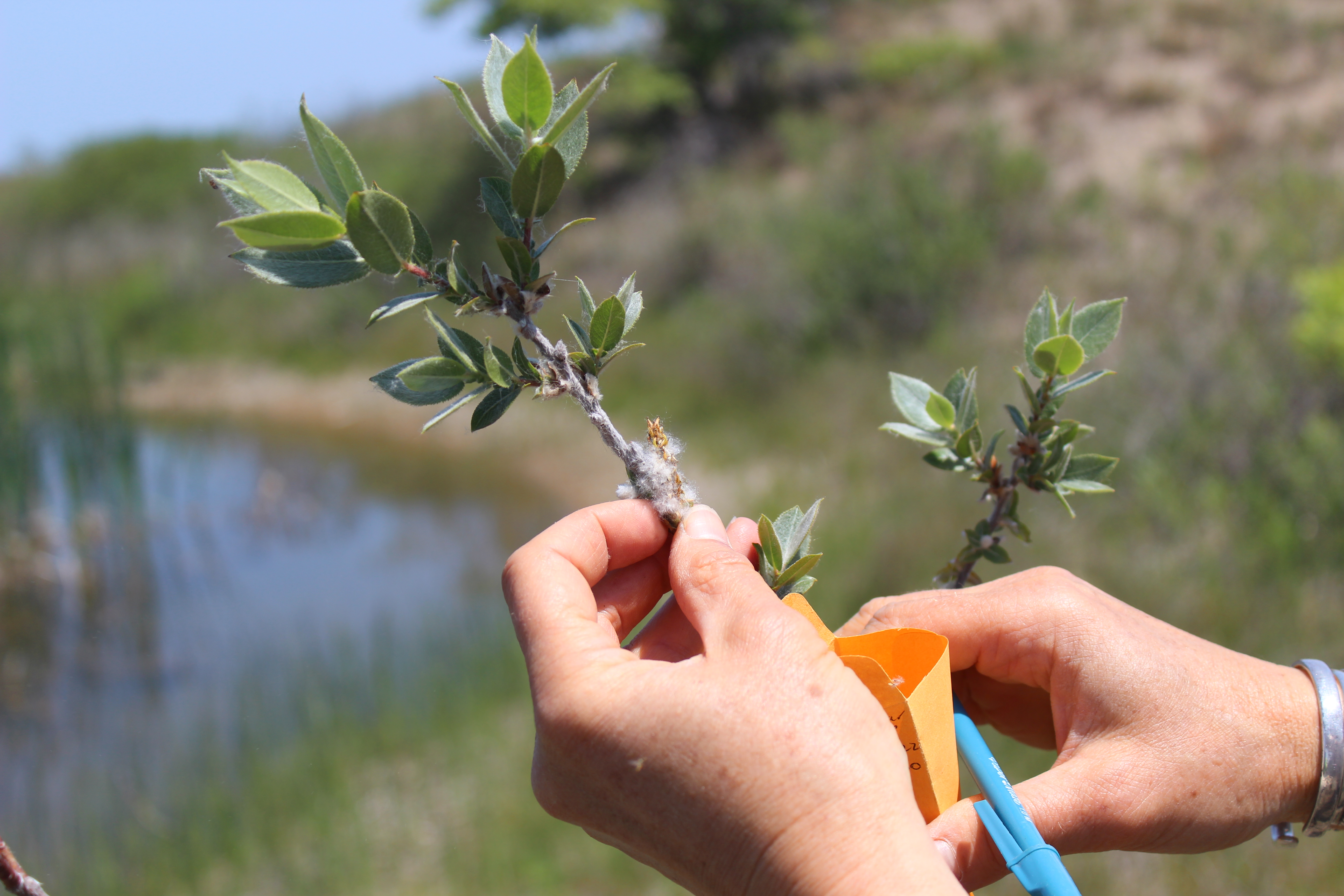 Searching for willow seeds is not as straightforward as it may sound. Nearly all willows (Salix spp.) are dioecious — meaning individual plants are either male or female. So first, we were tasked with determining each found individual’s sex, as only females can bear seed. After close examination of several plants, we finally located a female Dune Willow with ripe fruit!
