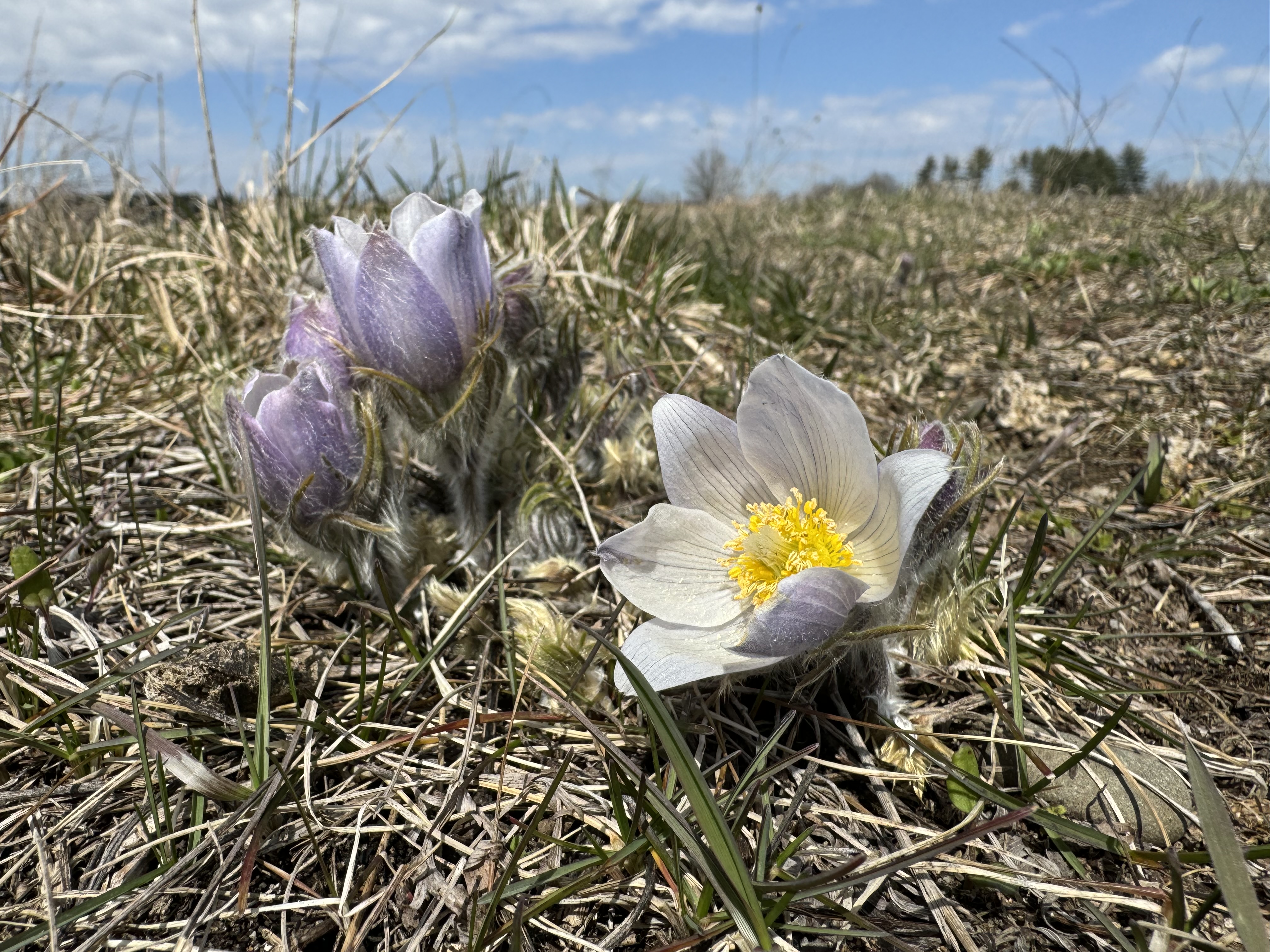 Left: Prairie Pasqueflower (Pulsatilla nuttalliana) in bloom at Nachusa Grasslands, March 28th, 2024. Photo by Grant Fessler.